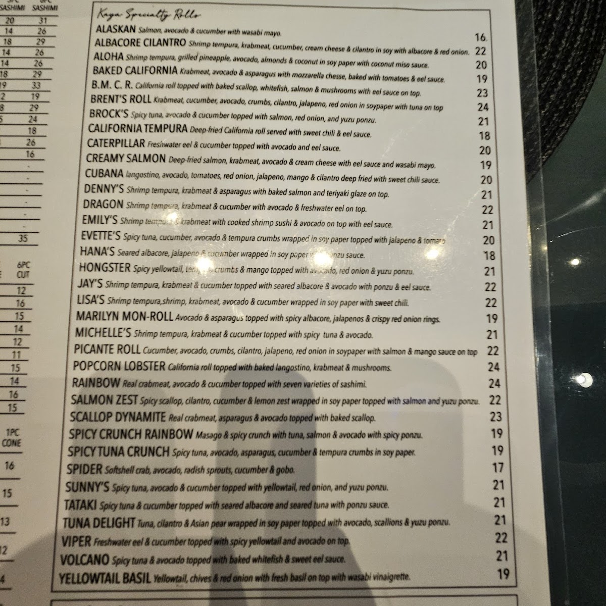 Thinly sliced of 4 sashimi with red onions, jalapenos, yuzu ponzu and each topped with its own personal flavor: tuna (garnished with cilantro), yellowtail (garnished with shiso leaves and chives), salmon (with yuzu citrus, radish sprouts and chives), and albacore (with garlic chips and chives).