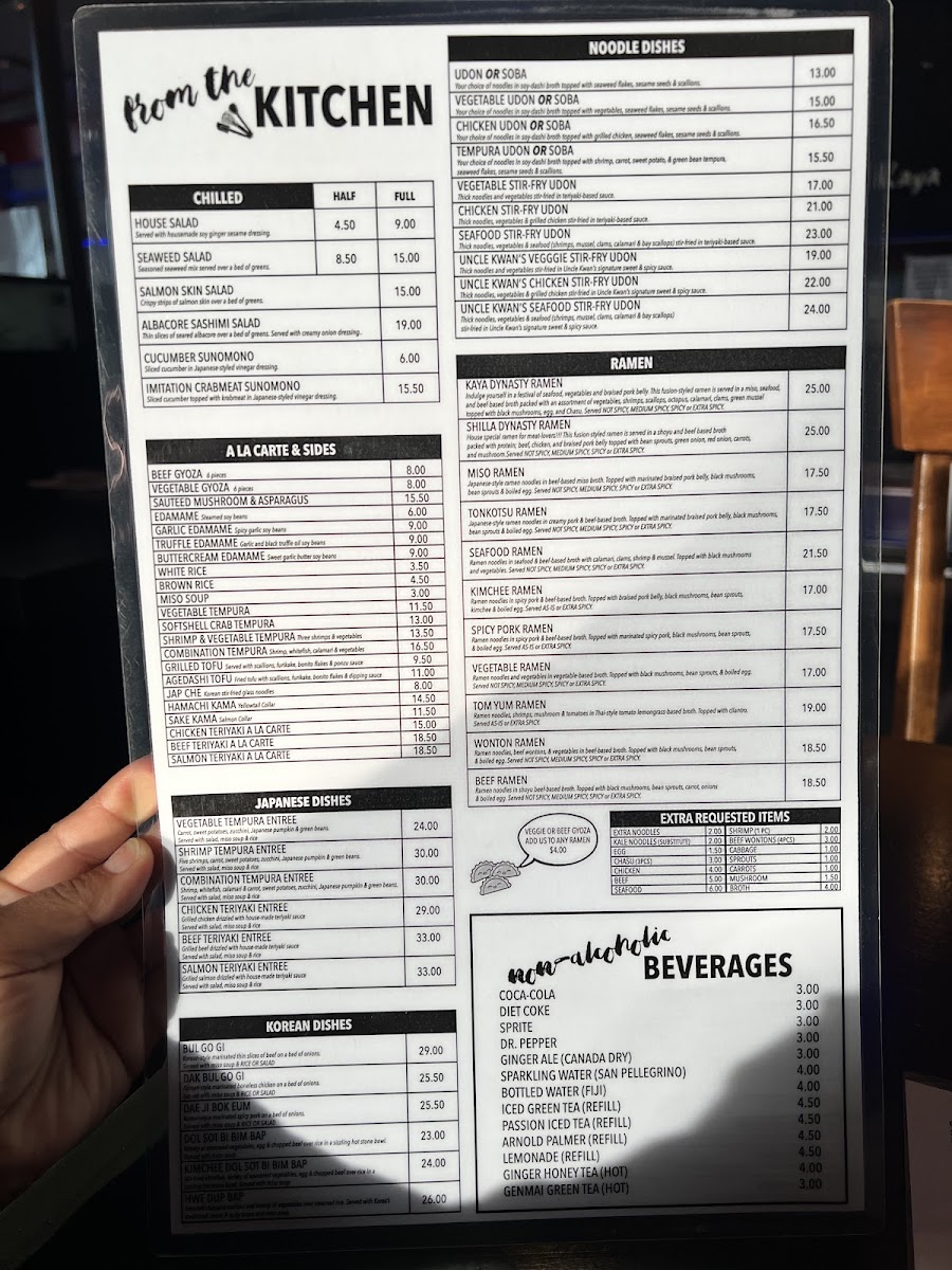 Ramen noodles, beef & vegetable wontons, and vegetables in beef-based broth. Topped with black mushrooms, bean sprouts, and boiled egg.